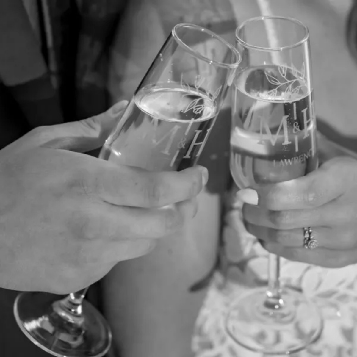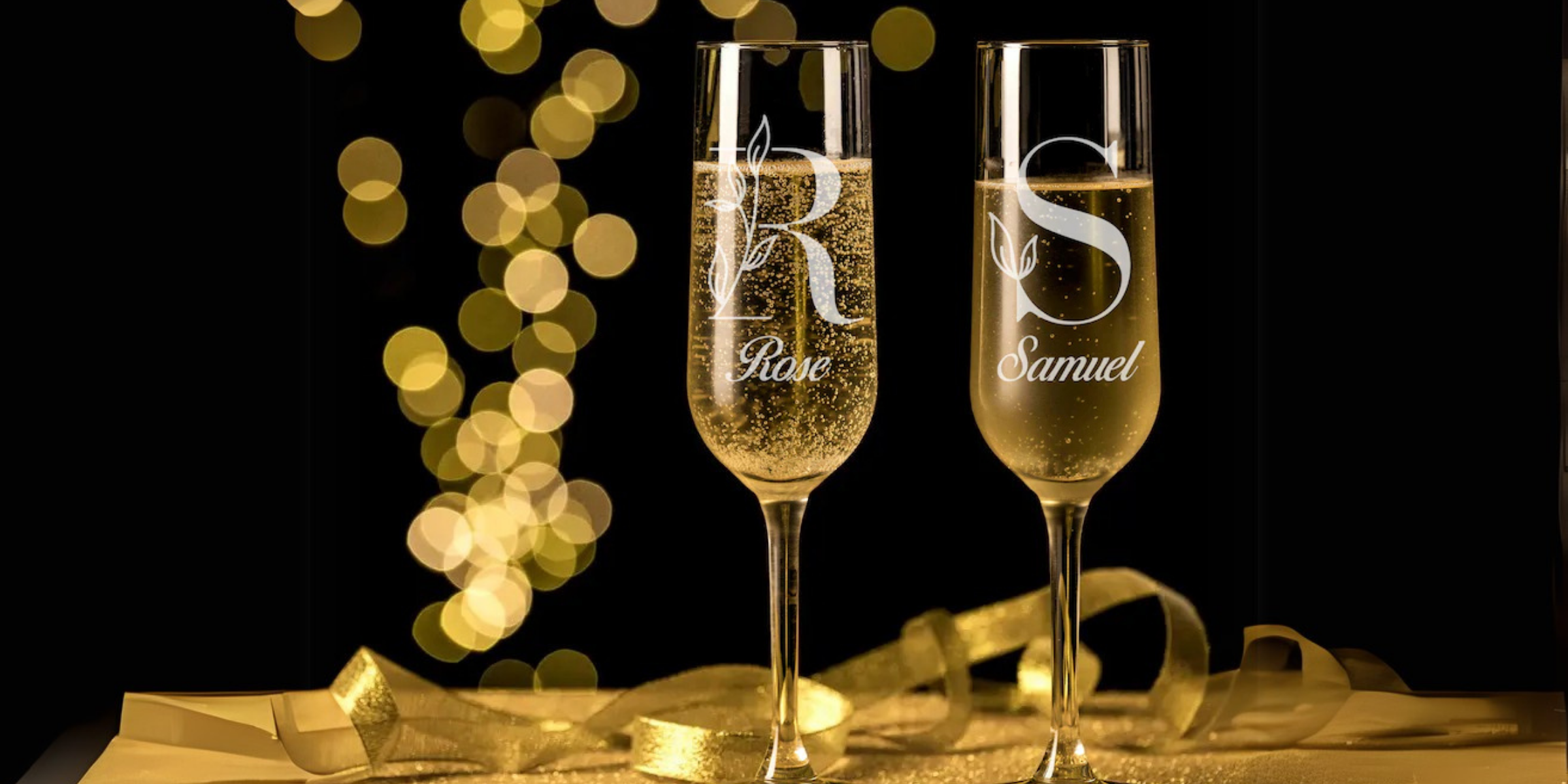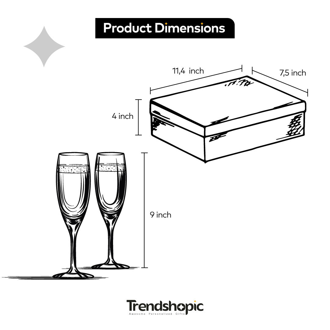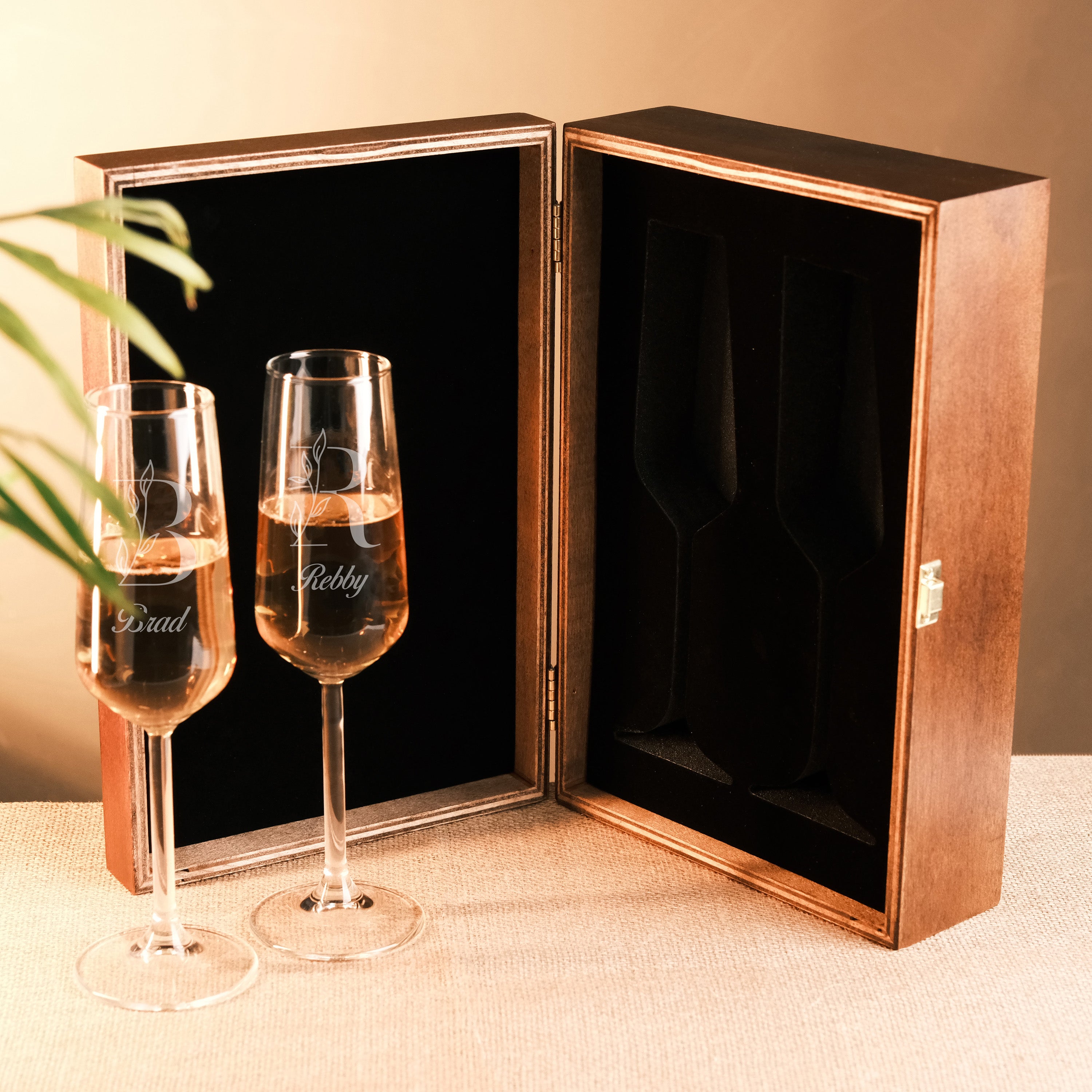 Each set comes in a carefully crafted wooden box with two different box options and **12 custom design templates** available for personalization. The inside of the box is lined with sponge and fabric, adding to the luxurious feel and ensuring the safety of the items inside. The box is finished with metal hinges and features a timeless **laser engraving** that ensures durability. The flutes included are premium-quality champagne glasses designed to enhance your experience by keeping the bubbles alive longer.