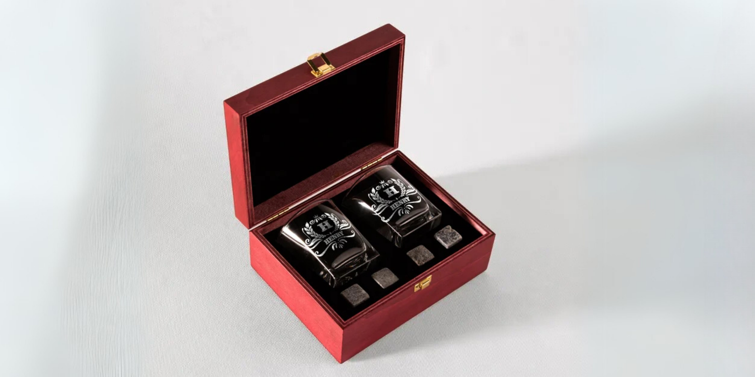 You can personalize each set by selecting from a variety of design templates in the Personalization section. You can engrave different names or initials on each glass and the box, creating a one-of-a-kind gift for any occasion.