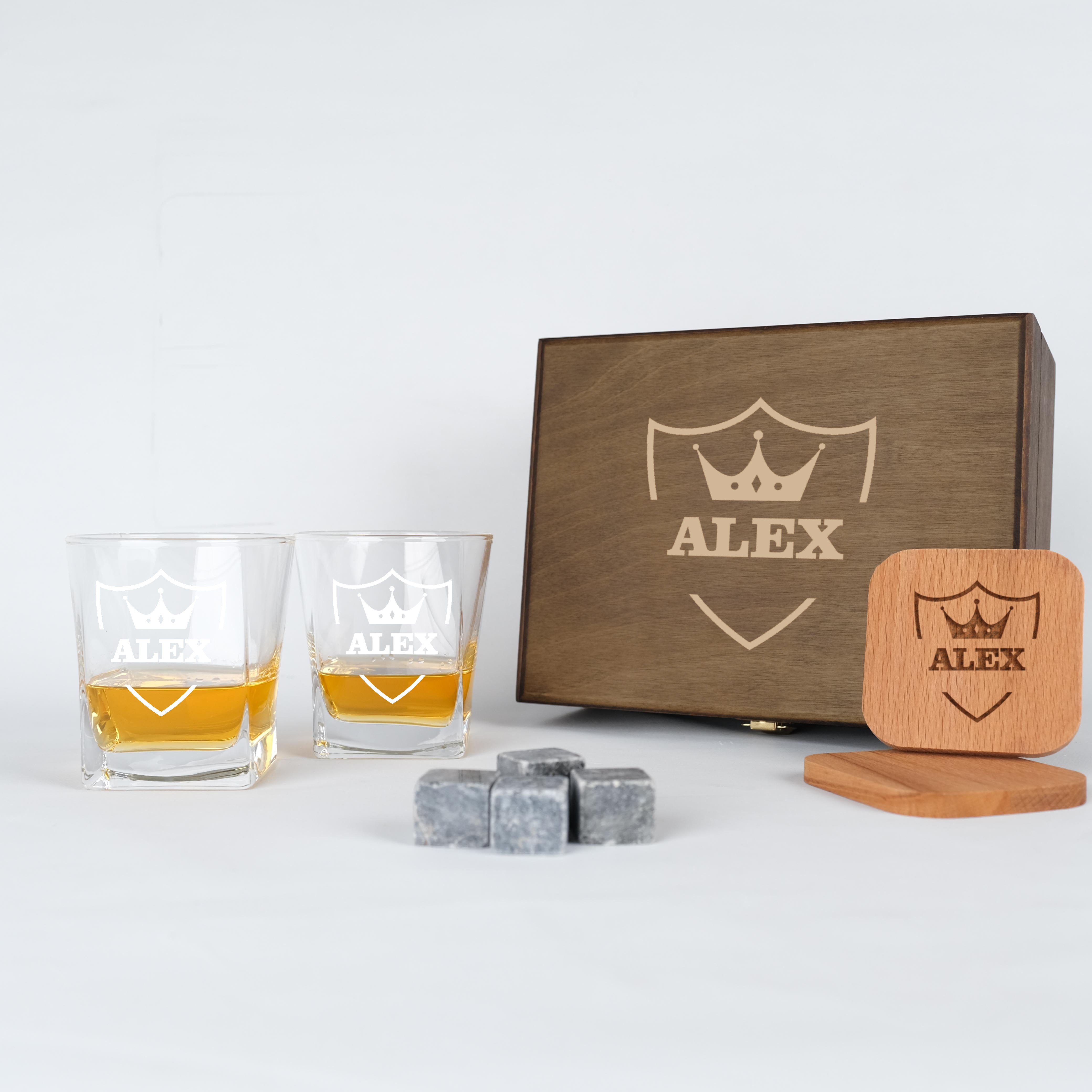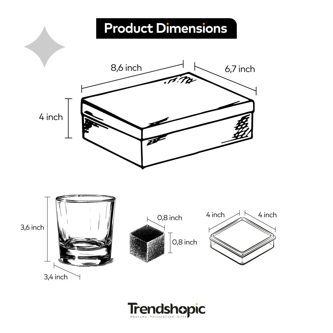 This elegantly designed personalized whiskey set is the perfect gift for groomsmen, Christmas, birthdays, anniversaries, housewarmings, job promotions, or retirement celebrations. Each set is of premium quality, featuring a beautifully crafted birch wood box that can be personalized for a truly unique gift.