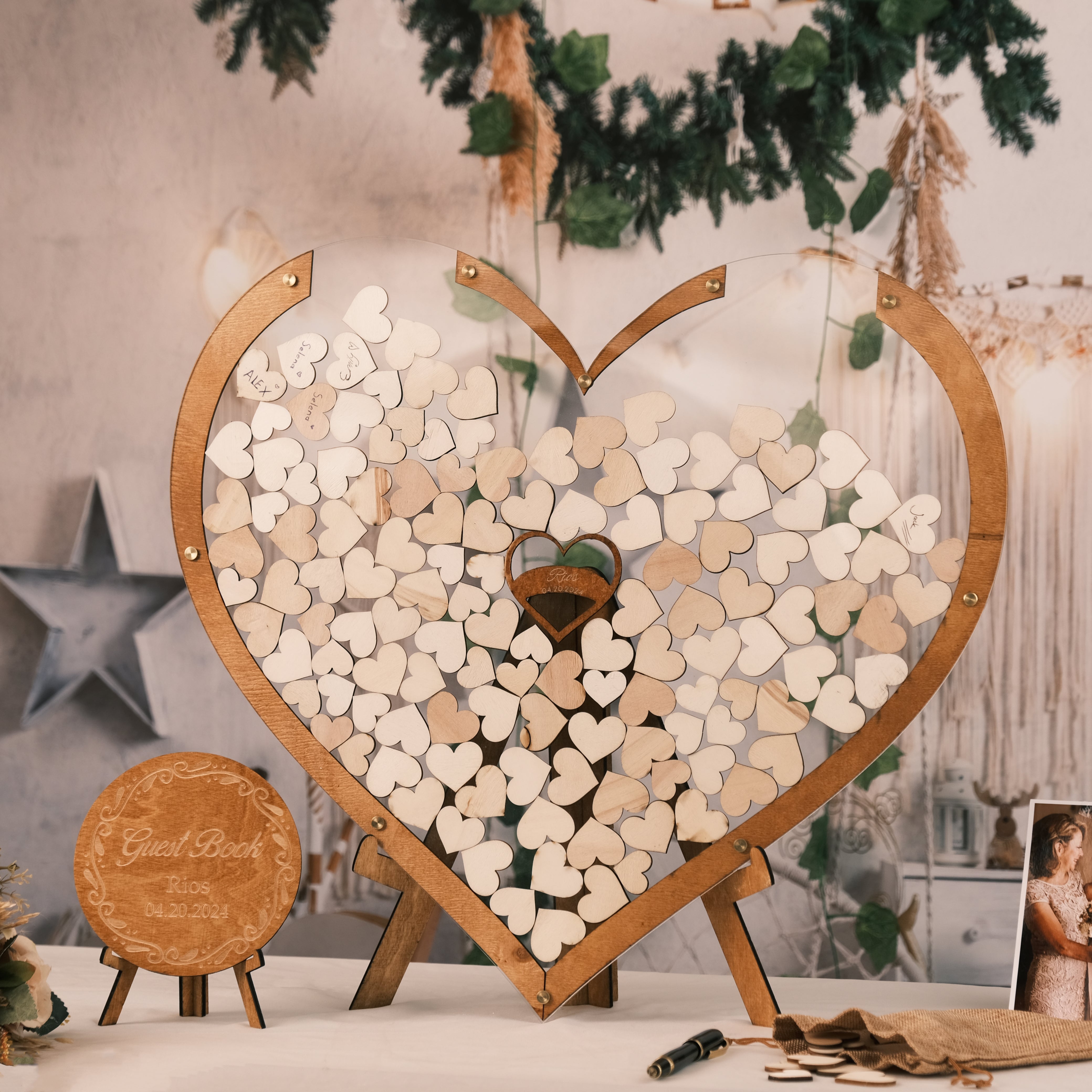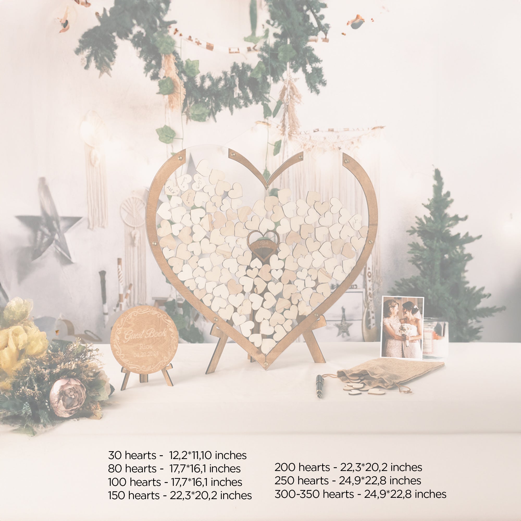 This Hearts Wedding Guest Book Alternative is a beautiful and unique way to collect memories from your wedding guests. Made from high-quality wood, it features a rustic design with a heart-shaped drop box for guests to drop their cards into. The guest book can be personalized with your names, wedding date, and a special message to your guests. It also comes with glue sticks and instructions for easy assembly and use. This guest book is perfect for any wedding, engagement party, bridal shower, or baby shower and will make a cherished keepsake for years to come. Offering a range of heart counts from 30 to 300, this guest book alternative is designed to suit celebrations of all sizes. Select from two elegant frame shapes - Heart or Rectangle - to match the theme and aesthetic of your event